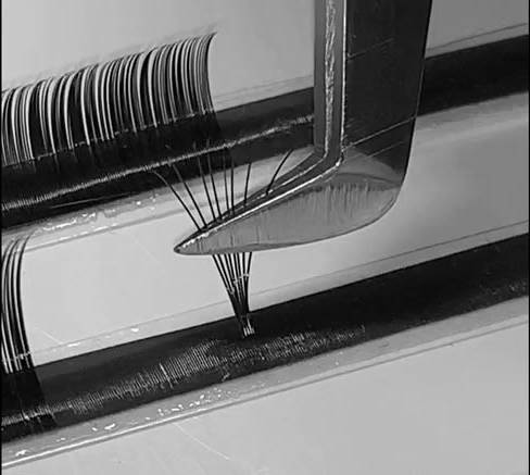 3 Когда вы берете нужно количество ресничек, снимаете полностью и ставите рядышком. И уже здесь на самой ленте непосредственно рядом формируйте пучок. В тот момент, когда он раскрывается наиболее красиво остается только его снять. Зажали-сняли.