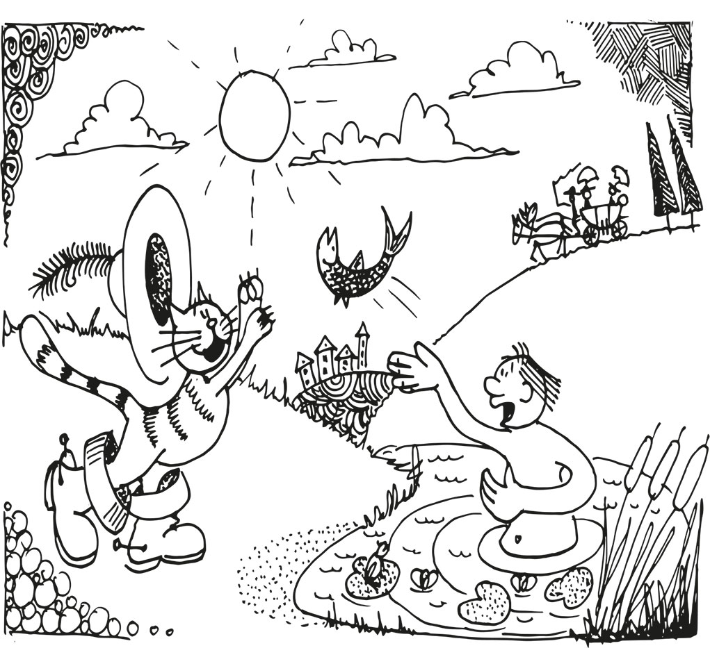 Юноша нырнул и вскоре вода в этом месте забурлила подводной борьбой. Вынырнувший Себастьян держал в руке довольно крупного налима и победно улыбался. Снисходительно улыбнулся и кот. Хозяин кинул ему добычу, и кот зубами оттащил налима подальше от кромки воды. Так они наловили около полудюжины рыбин. Для удобства сбора рыбы кот надел сапоги Себястьяна, а на голову водрузил его шляпу, чтобы поля ее прикрывали глаза от солнца.
