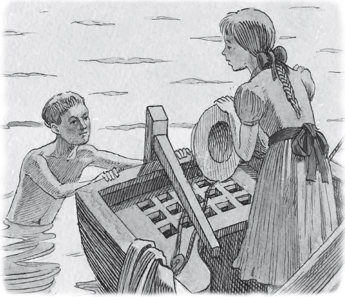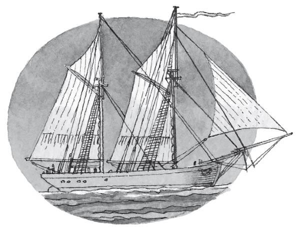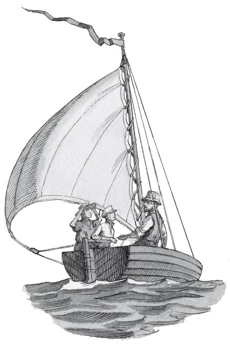 Чуть только рассвело, мы с Ниной тихонько вылезли из окошка, взяли с собой наш хлеб и бутылки в шлюпку. Я поставил паруса, и мы вышли в море. Я сидел, как капитан, а Нина меня слушалась, как матрос.