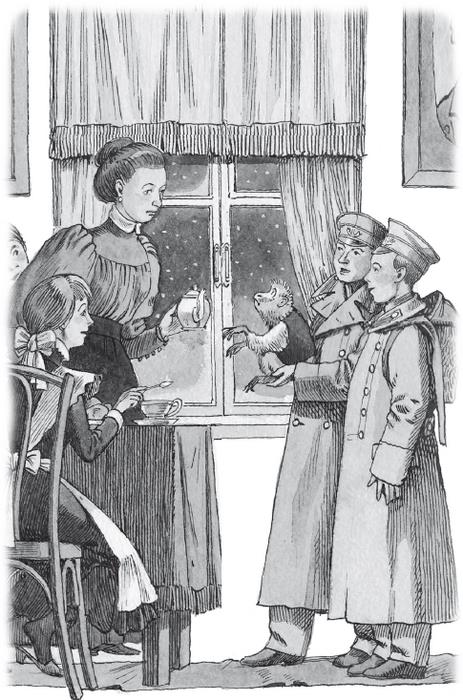 Юхименко распахнул шинель. Никто ещё ничего разобрать не успел, а Яшка как прыгнет с Юхименки маме на голову; толкнулся ножками и на буфет. Всю причёску маме осадил.