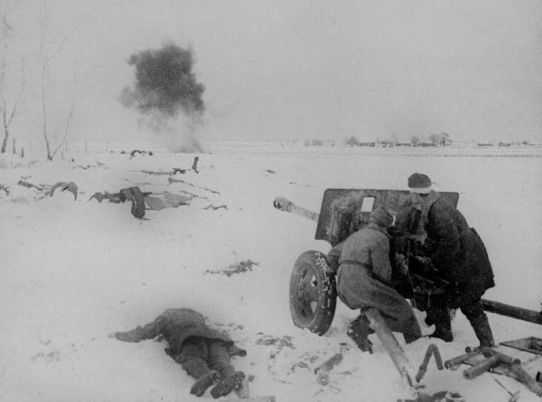 Так вот первый бой… Как я узнал уже после войны, нас бросили затыкать прорыв группы Манштейна, которая шла на выручку Паулюсу. Мы снялись с занимаемых нами позиций и, совершив марш, к вечеру подошли к населенному пункту, не помню сейчас его название, находившемуся на пригорке. На его дальней окраине шла перестрелка, в низинке, в которую спускалась центральная улочка, было тихо и темно, только скрипели полозья да пофыркивали лошади, тянувшие в горку наши орудия, рядом с которыми шли их расчеты. Стало как-то жутковато. На пригорке нас встретил командир взвода младший лейтенант Курбатов. Показал на хату, крытую соломой, в конце улицы и сказал, что с ее крыши бьют снайпер и автоматчик. Мы отцепили пушку с передка и, скатившись с дороги, установили орудие возле колодца. Это было большой ошибкой, поскольку пространство вокруг колодца было покрыто ледяной коркой, образованной расплесканной из ведер водой. Я установил прицел «на осколочный», навел, выстрелил. Снаряд попал в стропила (если бы он попал в солому, то просто пролетел бы насквозь) и разворотил крышу. Больше с нее никто не стрелял. Некоторое время мы просидели за щитом орудия, не видя других целей, как вдруг впереди раздалась очередь. Я выглянул поверх щита. Горело несколько домов, отбрасывая на дорогу желтоватые блики. В свете пожаров я увидел впереди, метрах в двадцати пяти, немца в белом маскхалате, державшего в руках наперевес пулемет. Видимо, он поднялся осмотреться. Пока я наводил орудие, он уже опустился. Почему я долго наводил? Да потому, что при переходе на зимнюю смазку мы схалтурили и остатки летней смазки замерзли. Но я по тому месту, где он был, сделал два-три выстрела. В это время командир взвода Курбатов подал команду отходить. Как же так? Мы еще не навоевались, только чуть-чуть стрельнули, и отходить! Сидя схватились за станины, на попе ерзаем, а сдвинуть пушку не можем – ноги проскальзывают на льду. И тогда я выскочил за щит, на сторону немцев, и толкнул орудие, сдвинув его с наледи на утоптанный снег дороги. Пулеметная очередь, простучав по щиту, разбила коробку, в которую укладывался прицел (я еще выругался, ведь в ней был ключ от прицела), но меня не зацепила. Не дожидаясь, пока немцы еще раз откроют огонь, я нырнул за щит и вместе, сидя и упираясь ногами, мы смогли оттащить орудие. Когда почувствовали, что вокруг стало стихать, развернули орудие и покатили его по улице. За спиной мы услышали шум танка – рев двигателя и клацанье гусениц. Кто-то крикнул: «Слышу шум мотора!» Справа, метрах в десяти, стоял сарай, но до него еще надо было добраться по слегка влажному снегу глубиной выше колена. Вспомнился фильм «Александр Невский» и врезавшаяся в память фраза: «Помирай, где стоишь». Я так и сказал. Слава богу, на меня никто не обратил внимание. Расчет подхватил орудие и покатил. Однако нижний щиток, расположенный между колесами, стал загребать снег, и через полтора метра толкать пушку вперед стало невозможно – она встала перед ею же образованным снежным валом. Матчасть я знал отлично, даром что работал в отделе технического контроля. У меня было личное клеймо номер 183, и на многих частях этого орудия стояло именно оно. Я говорю: «Стойте!» Нагнулся, снял защелку и поднял щиток. Пушка пошла, а я был реабилитирован за свою выходку. Мы подкатили ее к сараю, развернули в сторону танка, который н