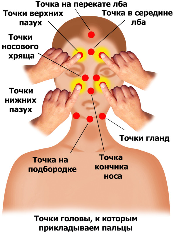 Далее переходим к работе с точками верхних гайморовых пазух. На этих точках держим свои пальцы также ориентировочно десять минут. После этого переходим к работе с точками носа. Им уделяем в среднем около пяти минут. Как и верхние, нижние гайморовы пазухи требуют длительной работы, то есть, с ними работаем около десяти минут, после чего переходим к точке подбородка. Работу проводим в течение пяти минут. После работы с точкой подбородка переходим к работе с точками горловой части – точкам гланд. Работа с ними может продолжаться около трёх минут.