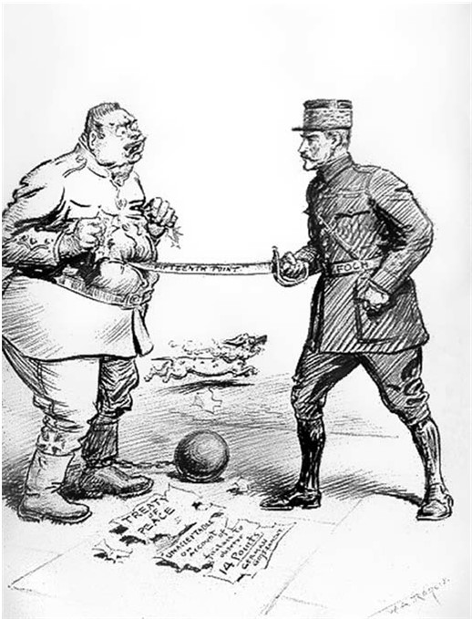 Американская карикатура того времени. Договор с 14 пунктами Вудро Вильсона валяется разорванным на полу, на французской сабле, приставленной к немецкому животу, написано: «15-й пункт»