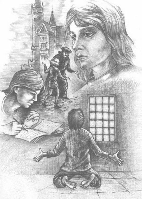 В ответ вспыхнул яркий свет, как будто включили электричество. На секунду Титус ослеп и даже, кажется, снова потерял сознание. Когда же зрение вернулось к нему, он увидел перед собой одетого в нелепый черный балахон лысого, но еще весьма свежего старика с широкими усами и огромным горбатым носом. Нос, надо сказать, был главным, все организующим элементом лица. На нем держались большие круглые, как глаза филина, очки с толстыми стеклами-иллюминаторами. А еще чуть повыше хитро блестели черные глаза, словно предупреждавшие Титуса: у меня, дружок, приготовлен для тебя сюрприз. В самом деле, не говоря ни слова, старик протянул ему какую-то свернутую трубкой бумагу, обмотанную шелковым шнурком с висящей на нем красной сургучной печатью. На неровной по краям печати был вытиснут герб – длинный меч, зависший между солнцем и месяцем. Титус, который словно того и ждал, без лишних вопросов жадно схватил свиток, быстро развернул его и залпом прочел: