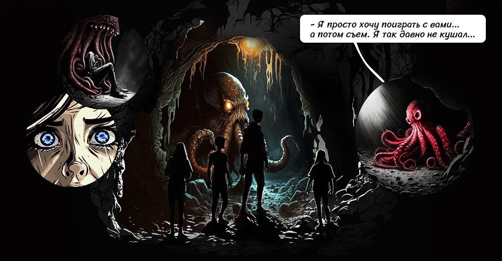 Щупальца стали обвиваться вокруг ребят, сдавливая купол. С громким хлопком защита пала. Развернулись боевые скрипты и первой не повезло в панике отступиться Лене. Упав, она дико закричала. Щупальца же, обвив ее ногу стали тащить в темноту, где загорелись два больших янтарных глаза.