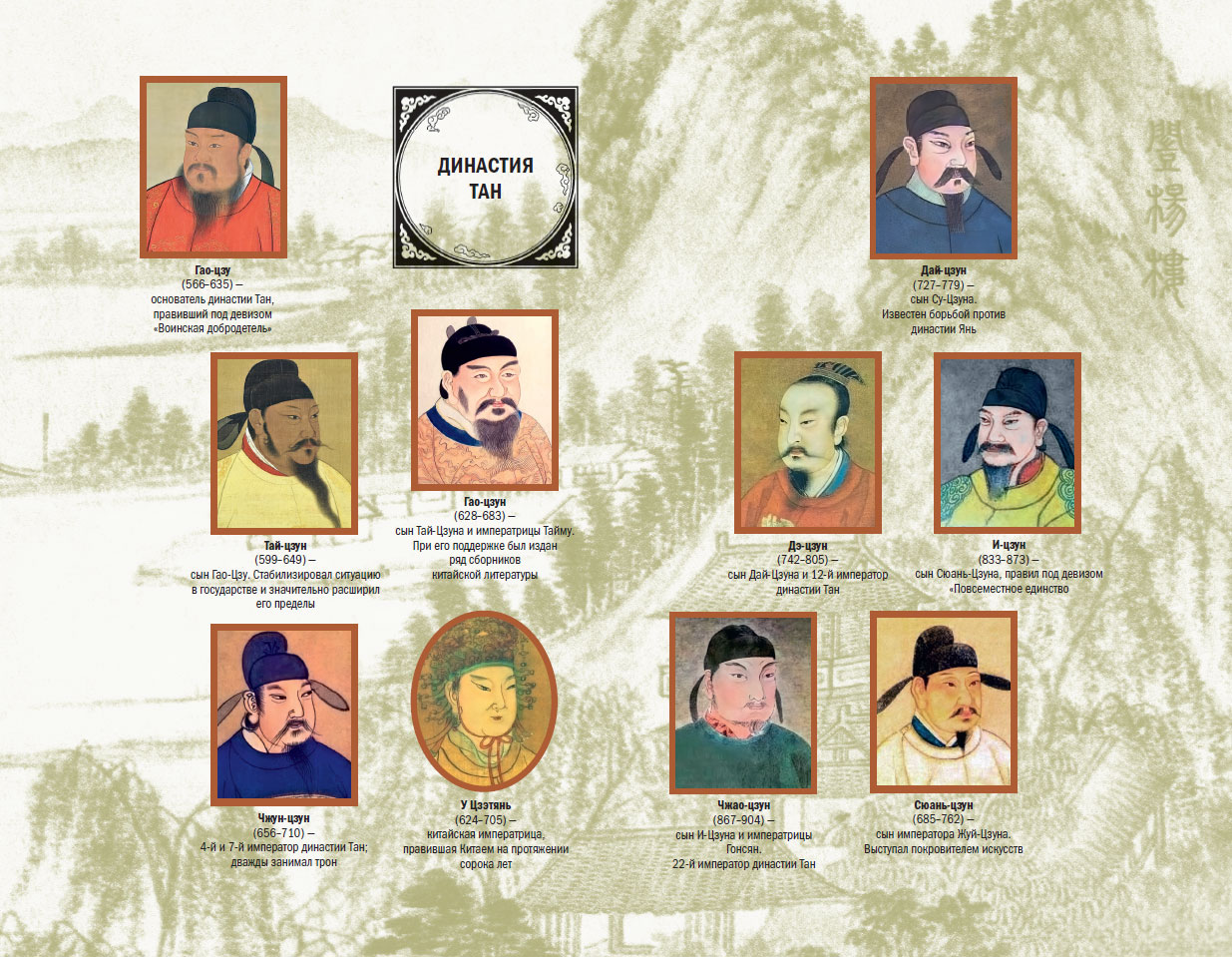 имя, полученное при рождении, – У Мэй. Императрица, правившая с 665 по 705 год. В 690 году приняла императорский титул «хуанди» и провозгласила основание новой династии Южная Чжоу, единственной представительницей которой была она сама. В 705 году под давлением высших сановников была вынуждена передать власть своему сыну Ли Сяню (императору Чжун-цзуну). Традиционно принято относить У Цзэтянь к танским правителям, несмотря на провозглашение ею династии Чжоу.