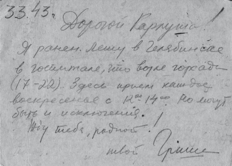 Дядя Гриша Чухрай был, наверно, самым близким другом отца по школе и по жизни. «Иринка» – его молодая жена, с ней он прожил всю жизнь. Во время войны он был десантником. Смешно сказать, но в 1943 Чухрай попал вдруг в Челябинск. Там они неожиданно встретились. Война как разводила людей, так и сводила. У меня сохранилась открытка от Чухрая папе.