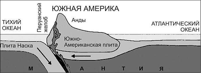 Схема субдукции. На месте столкновения плит не горы, а впадина