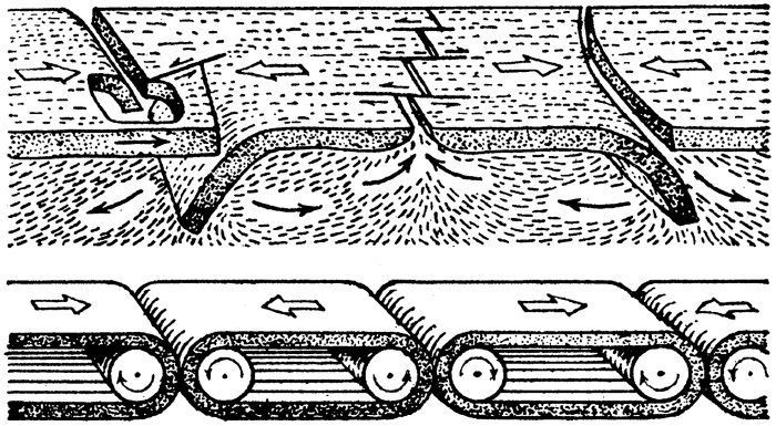 Что должно происходить там, где одна гигантская каменная плита движется на другую и вторгается в более плотные массы под ней? Мощные силы трения и давления должны сминать и дробить осадочные слои, состругивать их с океанической коры.