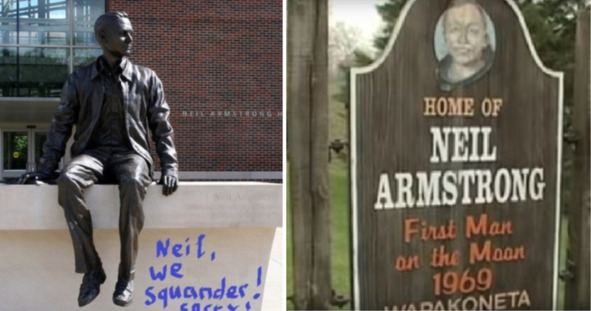 Но следует признать, что у музея появился второй памятник, посвященной Нейлу Армстронгу: «Изображение Нейла в виде подростка, держащего в руках модель самолета, которую он бы создал. Это одна из двух статуй, поставленных к 50-летию Аполлона 11. Скульптор: Час Фаган». [5] Это конечно серьезный сдвиг в деле почитания «лунного космонавта» из шоу «Аполлон-11». Полноценных, настоящие музеи, которые бы действительно были посвящены биографии «лунных космонавтов», в Америке так и не появились.
