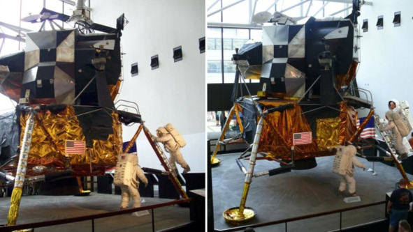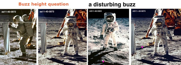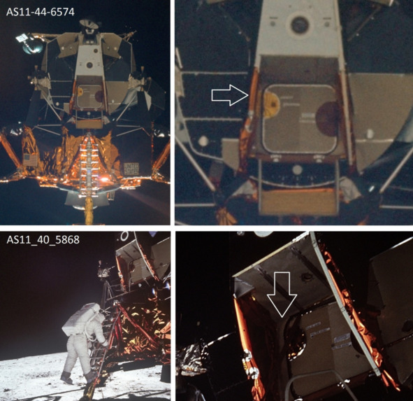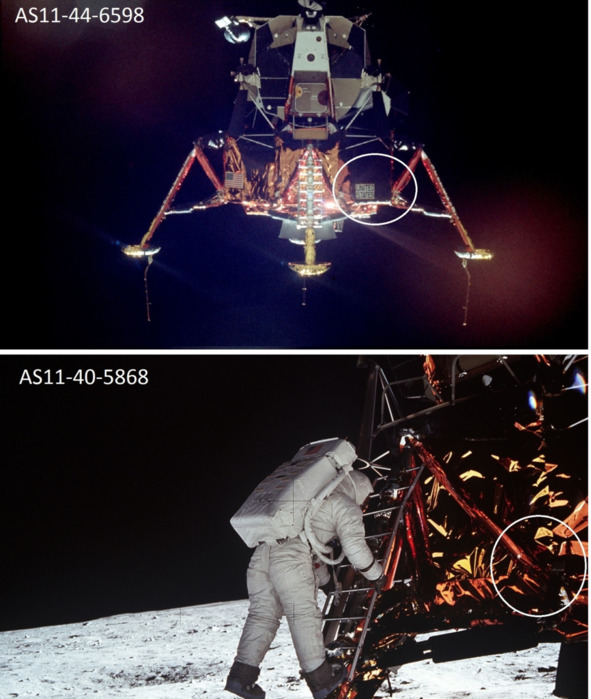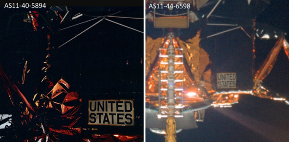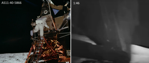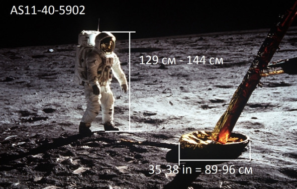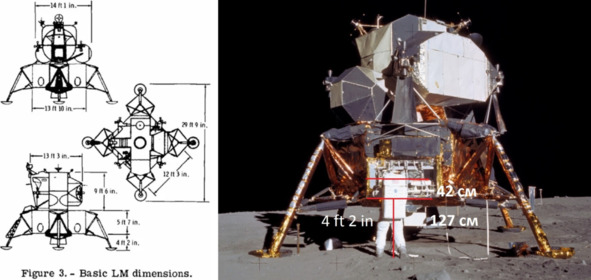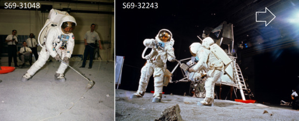 Но это не соответствует действительности. Фотография слева, «AS11-40-62», показывает, что «космонавт» спокойно входит в проем. В киностудии НАСА находился макет «Лунного Модуля», внутри которого, естественно, не было двигателя, порогов, других препятствий для размещения актеров. Скорее всего, размеры люка отличались от официальных размеров. Поэтому «космонавты» вползали без проблем и не испытывали трудностей. Главная проблема в этом эпизоде заключается в том, что в реальном космосе в вакууме, в тени происходит быстрое охлаждение до аномально низких температур, которые привели бы в негодность весь «Лунный» модуль.