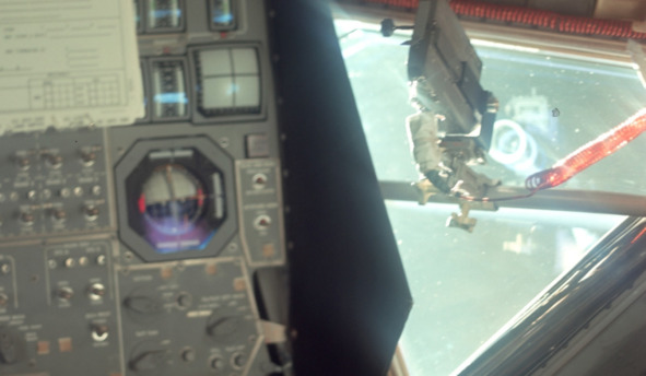 Джек Вайт обратил внимание и на голубые стекла треугольного иллюминатора «ЛМ». Возможно, что часть съемок проходила в помещении, где потолок не имел черной драпировки, но имел голубой цвет. В стекле могли отразиться окна, выходящие на улицу. Тогда в окнах иллюминатора «Лунного Модуля» могло отразиться земное, голубое небо. Джек без труда нашел на фотографии НАСА изображение окна иллюминатора голубого цвета. Американские рекламные агенты, защитники НАСА объяснили появление голубого цвета в окне иллюминатора, как некий оптический эффект, возникший из-за пленки на стекле. [24]