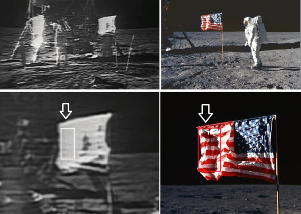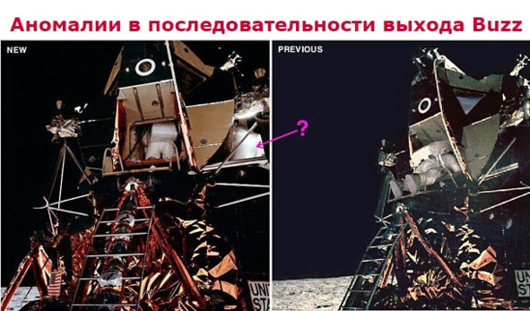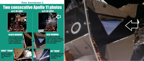 В пленке покрывающей стекло отразилась поверхность «Луны», вместе с черным горизонтом. При изменении направления фотографирования голубой цвет пропадает, и окно становится черным, такое объяснение защитников Лунного Обмана США было опубликовано в нескольких сайтах в Интернете, связанных со спецслужбами США. Нелепость подобных измышлений не требует особых исследований и подробного анализа. Исчезновение голубого фона в стекле при неизменном направлении «солнечного освещения», объяснить практически невозможно. Блики на поверхности «ЛМ», которые то появлялись, то исчезали, адвокаты американского обмана объясняли тем, что белые костюмы «космонавтов» отражали солнечный свет и подсветили теневую сторону «ЛМ». Американские пропагандисты большие умельцы придумывать разного рода оправдания. В этом они сильно преуспели! Фотографии НАСА «AS11-40-62» и «AS11-40-63», которые сравнивал Джек, показали появление светового блика слева от люка. Фотография справа, «AS11-40-63» создает иллюзию, что «космонавт» Базз не сможет пролезть в проем люка. Но это не соответствует действительности. Фотография слева, «AS11-40-62», показывает, что «космонавт» спокойно входит в проем. [24]