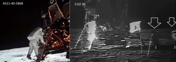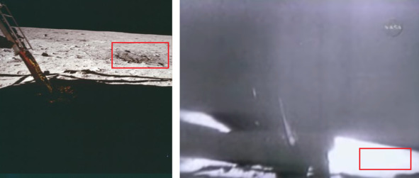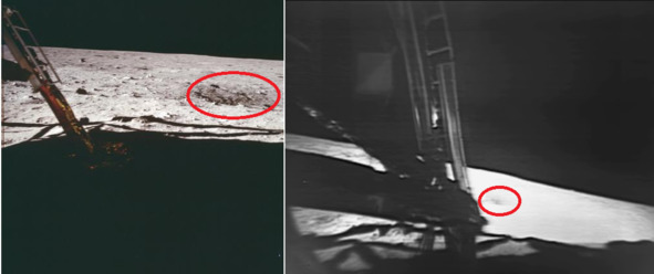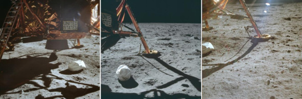 Следующие фотографии НАСА, справа налево: AS11-40-5850; AS11-40-5864; AS11-40-5865. [26], [27], [28] Аномалия этих безобидных фотографий состоит в том, что рядом с мешком нет следов «космонавтов» США. Если бы мешок бросили на поверхность горизонтально, то мешок бы оставил горизонтальный след на песочной американской «Луне». Самое забавное в этой ситуации это то, что на протяжении всей «лунной трансляции» почему-то в кадр не попал мешок с отходами. Его не было видно ни в начальный период выхода на американскую «Луну», ни в последующих эпизодах. Ситуация развивалась видимо так: декораторы положили мешочек с мусором, а потом замели следы и обработали песочный грунт вентиляторами.