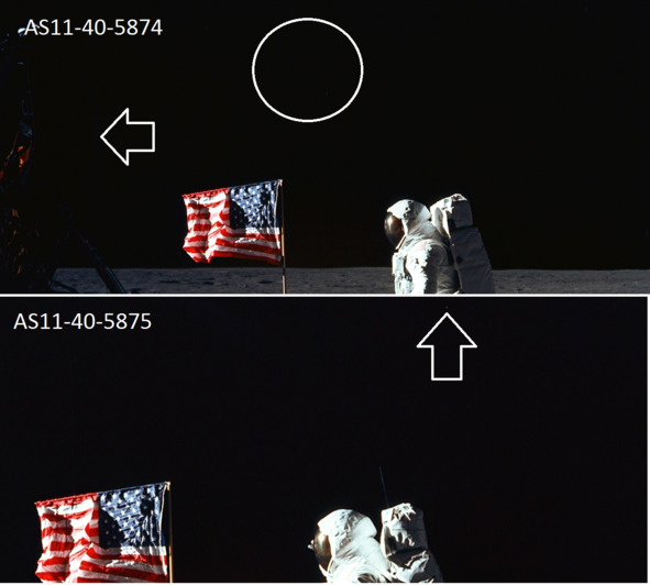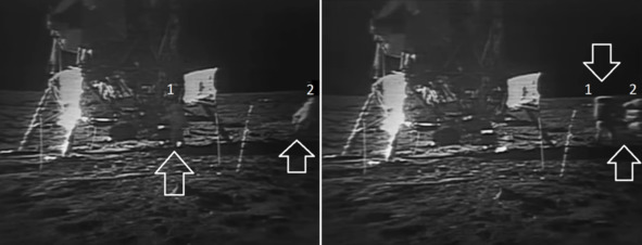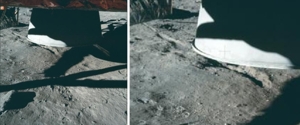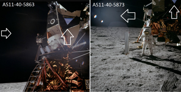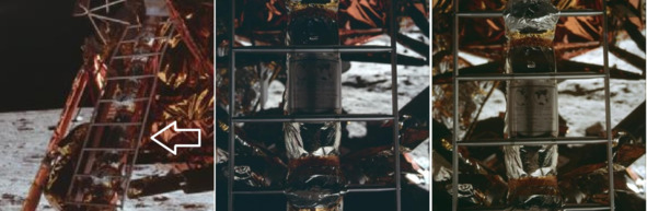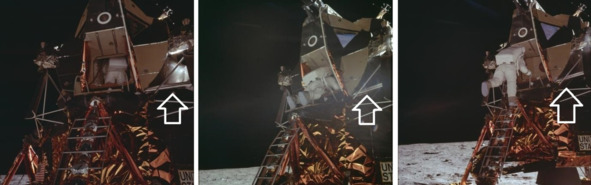 Все познается в сравнении. Если рассмотреть последовательный спуск «космонавта» с «ЛМ» по лестнице, то аномальное появление блика становится очевидным. Сначала этот блик виден, потом он исчезает. Ниже фотографии НАСА, справа налево: AS11-40-5862; AS11-40-5863; AS11-40-5866. [29], [30], [31] Направления съемки практически неизменно, с небольшими переходами фотографа вправо от лестницы. Но на фотографии 5862 блик от яркого света на правой стороне «ЛМ» виден, а на других фотографиях этот след от направленного освещения отсутствует. На следующих фотографиях этот след от освещения тоже не наблюдается. Предположительно, это была ошибка осветителей, однозначно, блик не является дефектом снимка.