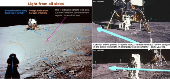По всей видимости, злоупотребление алкоголем, наркотиками, плохая организация киносъемки и фото сессии привела к такому большому количеству ошибок, допущенных фальсификаторами. Среди них несомненно является ошибочная система освещения киноплощадки, где разместился «Лунный модуль» и лунные актеры. Осветители слишком хорошо подсветили эту сцену и теневая сторона «ЛМ» стала хорошо видна. В процессе видео съемки такой подсветки не было, и теневая сторона оставалась темной. По причине ошибочной работы осветителей произошло явление, которое Джек Вайт назвал «Свет со всех сторон». [24] Аргументы этого критика Лунного обмана США не во всем были правильными и выверенными. На плоском изображении, идет искажение направления тени и освещения. Джек Вайт не понимал сущности некоторых оптических иллюзий связанных с переносом объемного мира на плоское изображение фотографии. Его аргументы «свет со всех сторон» и «разные источники света дают разное направление теней», тоже не так очевидны, как могут показаться с первого взгляда. Эти доводы очень спорные.