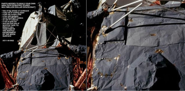Стрелки направления освещения можно нарисовать и по-другому и совпадение с краем тени будет аналогичным. Круг, нарисованный вокруг головы «космонавта», показывающий ореол, это тоже оптический эффект, хорошо знакомый фотографам того времени. Большой крестик в центре ничего не доказывает. Обманщики могут сказать, что такой же крестик был слева, но фотографию обрезали и отклонение теней влево результат искажения перспективой. Можно сочинить сказку о том, что слева от «космонавта» в обрезанной части тени отклонялись вправо. Другими словами аргументация Джека Вайта была слабой. Следующая фотография НАСА под номером 5922, наверное, самый забавный «лунный» кадр, который вызвал недоумение у многих американских граждан. Фотография очень удивила и Джека Вайта. Конструкция «ЛМ» была создана с помощью картона и скотча. Джек Вайт удивленно восклицает: «Это ЛМ, который действительно отправился на Луну? Крупным планом вид «Аполлон-11». К рассуждениям Джека, было приложено примечание редактора: «Это подлинная фотография Аполлона-11, номер файла НАСА AS11-40-5922, предположительно снятая на Луне. Эта фотография была, по-видимому, сделана сразу после серии крупных планов подушек LM. Используемая клейкая лента, скорее всего, была полиимидом или майларом». [25]