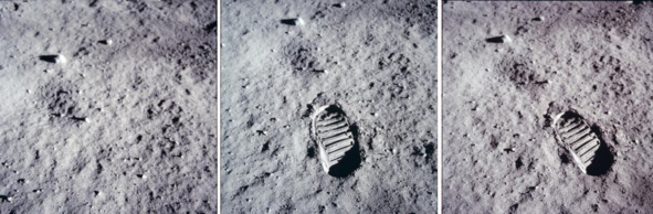 Фотограф сделал снимок приблизительно с того же направления, откуда снимала телекамера в первые моменты «прилунения». На фотографию НАСА попало теневое темное пятно кратера. Этот длинный кратер в кадры «лунной трансляции» не попал.