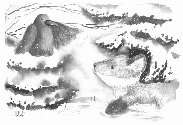 Лисёнок из предосторожности огляделся вокруг, но потом снова нырнул в снег и прокопал ещё немного, расширив отверстие лаза так, чтобы можно было разглядеть находку. Впрочем, находка и сама уже стремилась показаться на свет, отчаянно суча тоненькими ножками с копытцами нежно-розового цвета. Осторожно, чтобы не укусить находку ненароком, лисёнок помог отгрести снег носом и лапами, а затем отступил назад и притаился в снегу, с любопытством ожидая, кто же покажется перед ним.