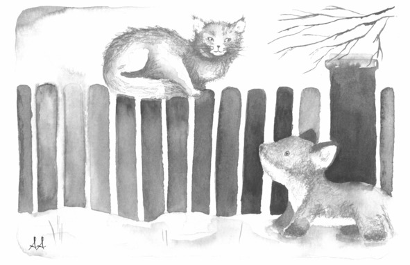 – Мрряу, – донеслось сверху, и лисёнок увидел огромного пушистого зверя – такого же рыжего, как и он сам. Это был кот, он сидел на заборе и наблюдал сверху за попытками рыжего незнакомца с острыми ушками и длинным пушистым хвостом проникнуть на хозяйский двор.