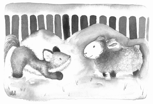 Стоя перед открытыми воротами, лисёнок нерешительно переминался с лапы на лапу и поводил ушками, прислушиваясь к голосам родственников и друзей ягнёнка. Те были заняты едой и не обращали внимания на пришельца. А ягнёнок протиснулся сквозь плотную толпу обступивших кормушку родичей и подобрался поближе к самой большой и уважаемой из обитателей овчарни. Заметив своего малыша ещё издали, мама Овечка радостно позвала его к себе, потрясая длинными ушами.