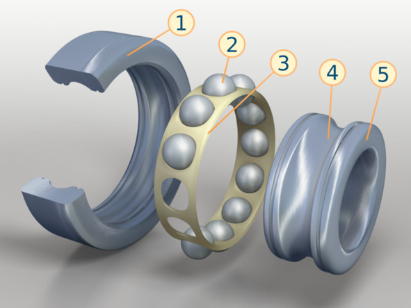 Рис. 1.1. Устройство радиального шарикоподшипника: 1 – внешнее кольцо; 2 – шарик (тело качения); 3 – сепаратор; 4 – дорожка качения; 5 – внутреннее кольцо
