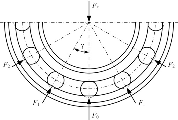 Исследование зависимости между силами F0, F1, F2…Fn с учетом контактных деформаций при условии абсолютной точности размеров тел качения и колец подшипника и отсутствии в нем радиального зазора позволило установить: