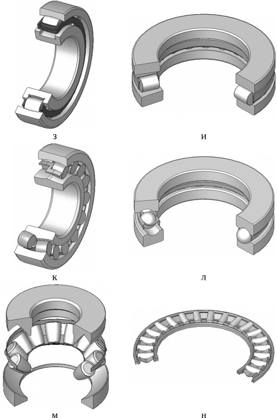 ж) радиально-упорный (конический) роликовый подшипник;