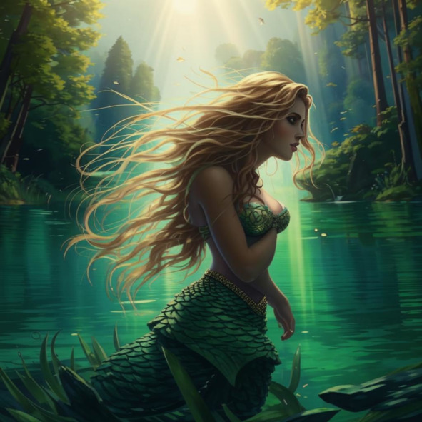 Я вздрогнул от неожиданности, выронив удочку. Медленно повернув голову на зов, я застыл с отвисшей челюстью. Из камышей на меня смотрело прекрасное женское лицо со странными жёлтыми зрачками и ядовито-зелёного цвета волосами. Девушка была по пояс в воде. Её обнажённая грудь вызывающе нацелилась в мою сторону двумя белыми бугорками.