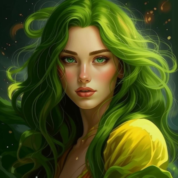 «Она была прекрасна! Я никак не мог налюбоваться её изумительной красоты лицом. Волны густых зелёных волос обрамляли его, словно шаль, ниспадая изумрудным переливом до самого пола. Кожа без малейшего прыщика отливала мраморной белизной и едва не светилась каким-то ярким внутренним светом. Правильные черты лица, глубокие, чуть раскосые глаза с жёлтыми зрачками – всё сводило к идеалу женской красоты.