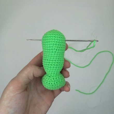 2.Кончик нити, оставшейся от вязания конечности вдеваем в иглу