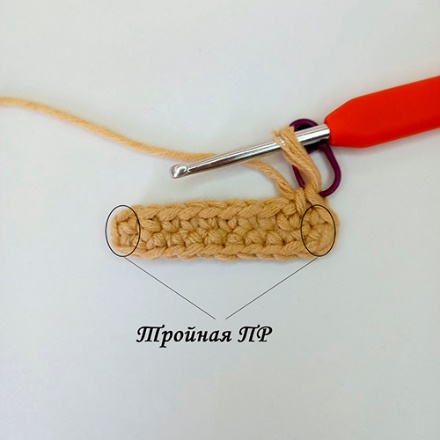 5.Под переднюю стенку ВП (фото 14), которая служила в начале ряда в качестве петли подъема, вяжем Тройную прибавку (3 СБН под переднюю стенку ВП подъема, фото 15).