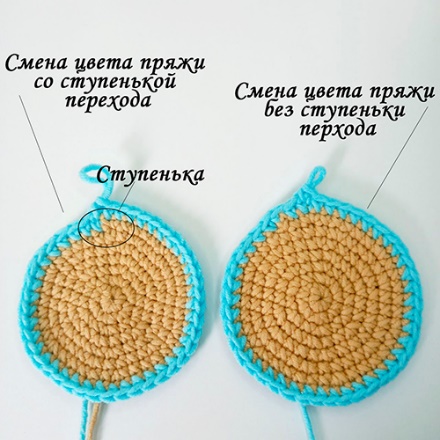 При вязании по спирали несколькими цветами пряжи, особенно когда это касается вязания порядовыми секциями (например вязание 3 рядов одним цветом, а затем 3-х рядов другим) существуют определенные особенности вязания, которые помогают избежать ступеньки перехода цвета (фото 30)