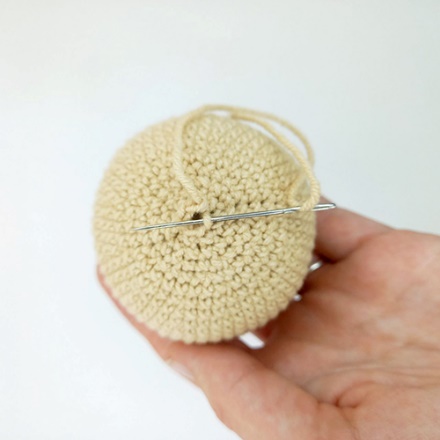 2.Берем две нити достаточно длинные (2 раза нужно прошить игрушку плюс длинные кончики для завязывания узелка). Одна нить, та же, которой вязали саму игрушку, вторая капроновая
