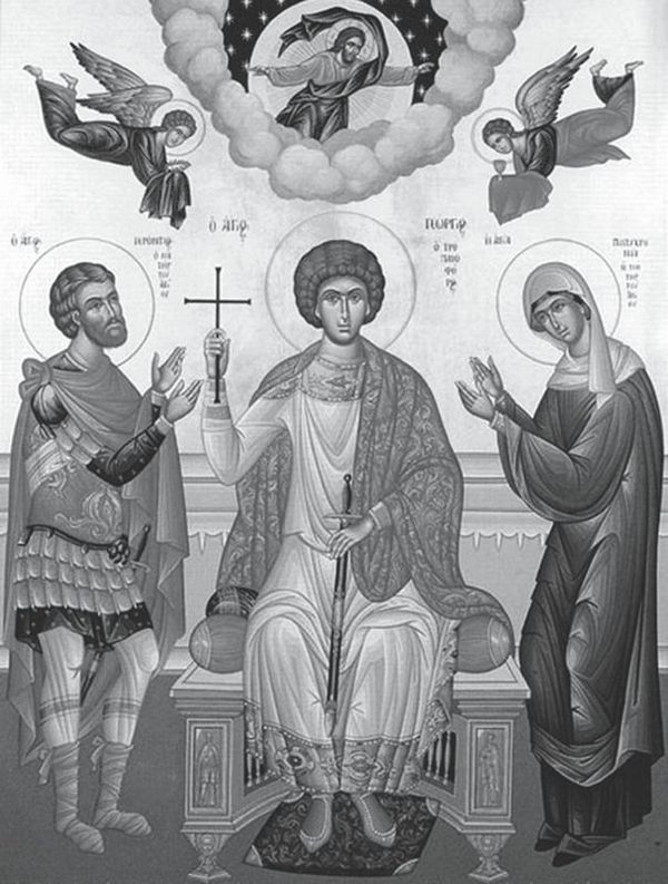 Великомучник Георгий Победоносец и его родители – мученик Геронтий и мученица Полихрония. Греческая икона