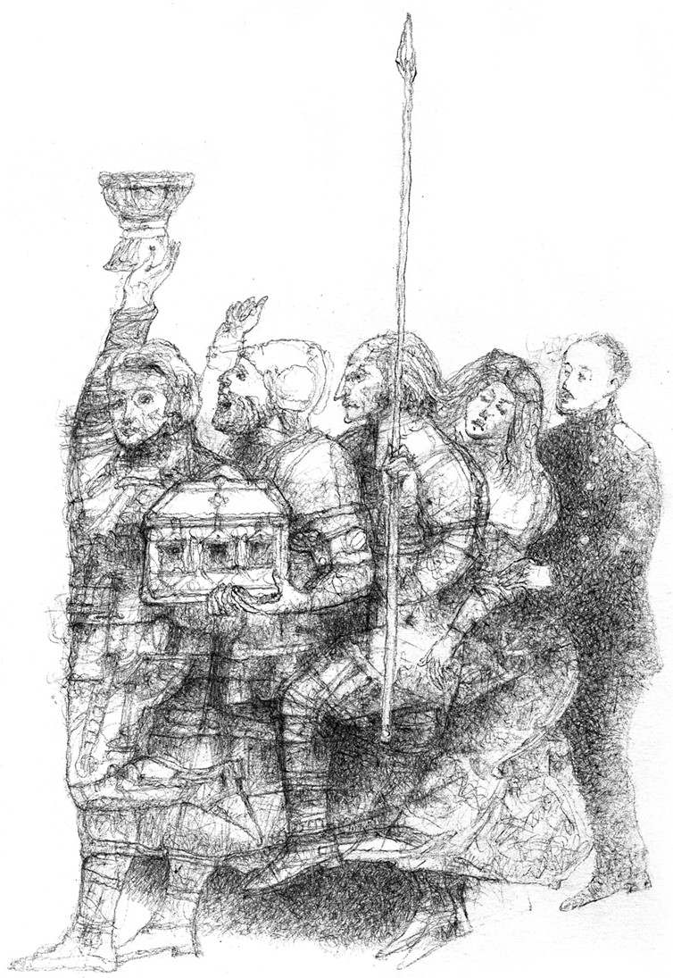 Последние полчаса оперы показались Толстому пересыщенными. Неспешное омовение и помазание Парсифаля на царство, а затем крещение Кундри напомнили ему статичные картинки из учебника «Закон Божий». Волнительный обряд похорон Титуреля, первого короля Грааля, с демоническим отречением его сына Амфортаса от служения Граалю (певец Григоров наконец-то распелся), походили на мрачные литографии Данте…