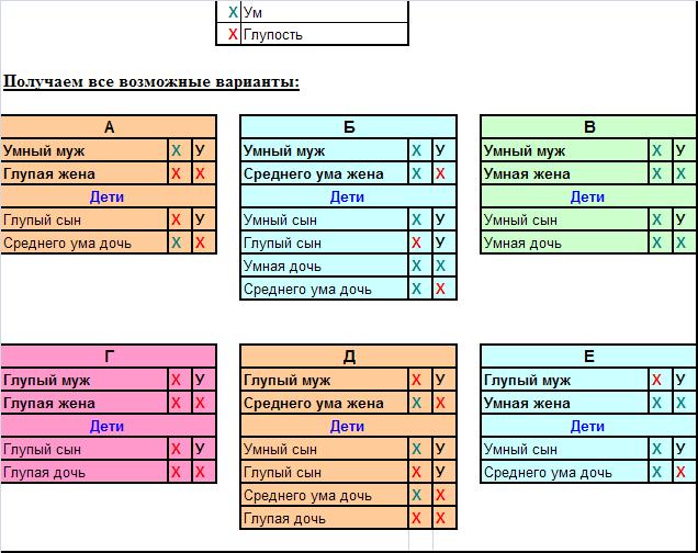 Так вот, упростим до предела ситуацию с генетикой и посмотрим, какие варианты людей у нас получатся, если по зелёной Х-хромосоме наследуется интеллект ("Ум" для простоты), а по красной Х-хромосоме – его отсутствие (запишем его как "Глупость").