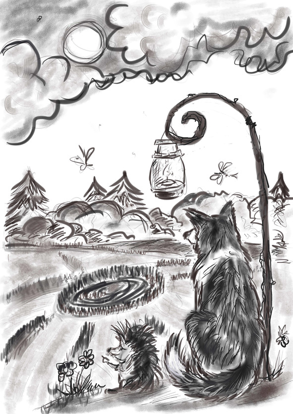 По наущению ёжиков, жители деревни установили шесты и палки с привязанными к ним старыми лампами, фонариками, керосинками и даже банками, внутрь которых были помещены свечи. Самодельные огоньки тускло мерцали, но все вместе очень хорошо освещали пшеничное поле. Ночь стала светлее, и оттого работа у ежей пошла намного бодрей. С сопеньем и пыхтеньем они вышагивали среди колосьев, доделывая свой узор.