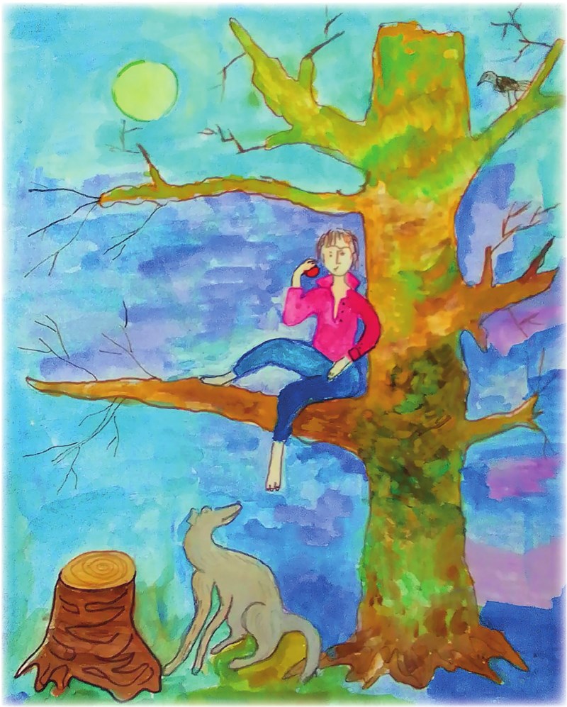 Однажды полезла на высокую ель, захотелось увидеть в дупле маленьких бельчат. Забралась на самый верх. Зверюшки просто очаровательны: три бельчонка, свернувшись клубочками, спали сладким сном. Похожи на маленькие игрушки. Вдоволь налюбовавшись бельчатами, стала спускаться вниз. Ветка под ногой треснула, девушка в страхе обхватила дерево руками. Взгляд упал туда, куда раньше никогда не смотрела. Сын садовника учил: «Не смотри вниз, когда спускаешься с дерева». Не послушалась, посмотрела…