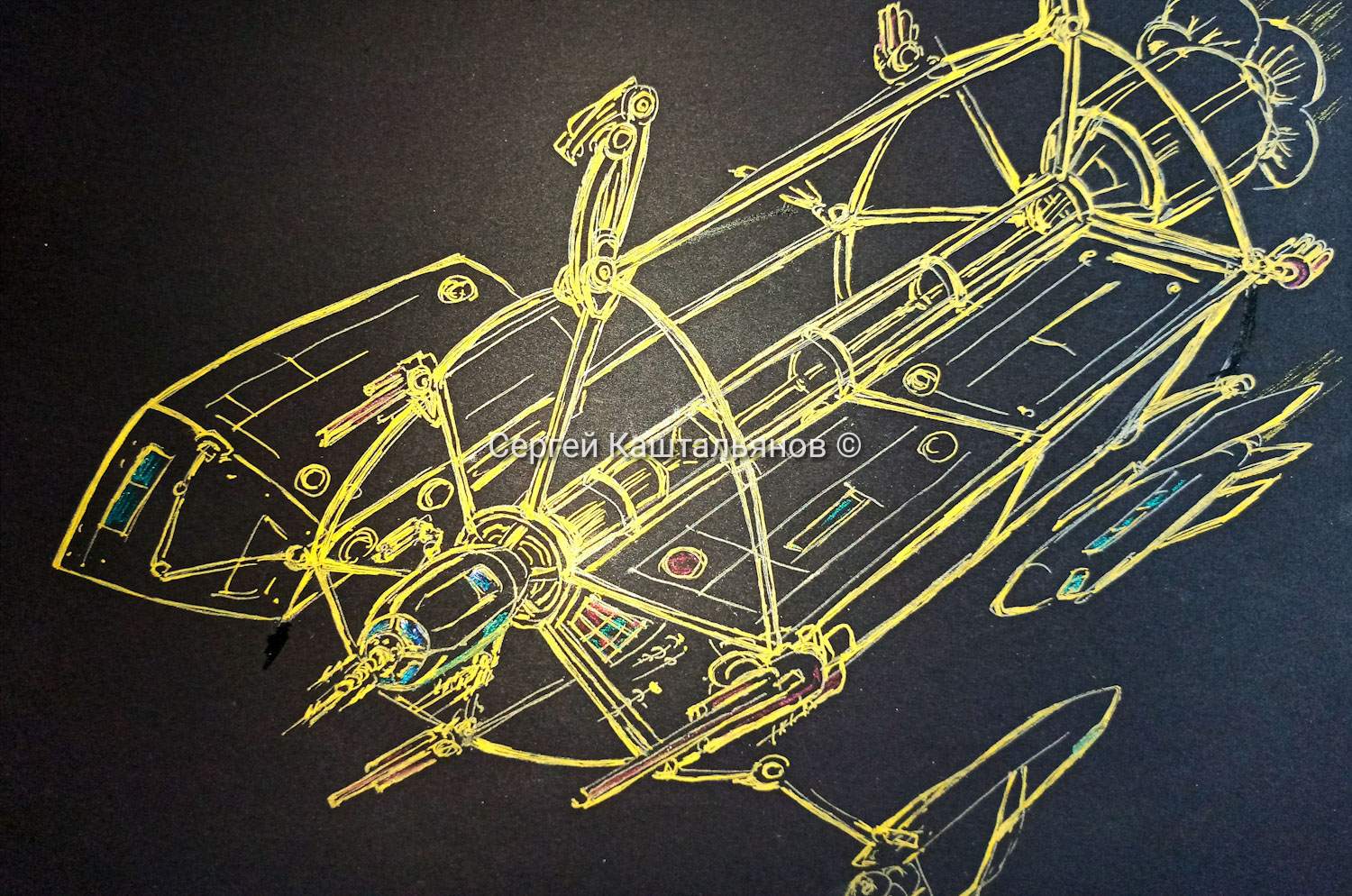– Ну вот, в общих чертах. Корабль состоит и центральной оси с маршевым двигателем и баками в корме. На носу рубка управления всем космованботом. В центре на открытом несущем каркасе костяка крепятся жилые и грузовые блоки с манипуляторами разгрузки-загрузке вот в этих узлах костяка. Ось несущего каркаса состоит из объёмной круговой несущей трубчатой конструкция с шахтами передвижения внутри. Шахты транспортёров шлюзами состыкованы с блоками. Пока есть возможность для двух жилых и одного грузового блока внутри. Вместе с пятью вооружёнными челноками, это позволить уже сейчас вместит комфортно 150 человек команды. Ось имеет свой маршевый двигатель и способна взлететь с наклонной направляющей в космос, вместе с жилыми блоками и пятьюдесятью человек команды. Следом за осью взлетают в космос отдельные челноки. Челноки в космосе ловятся и крепятся манипуляторами на стапеля оси, становясь частью ванбота. В каждом челноке по двадцать человек. Корабль собран, вооружён и защищён энергосферами челноков и установленными на носу и корме. Теперь на орбите сто пятьдесят человек. Включаем маршевые движки и движки челноков и летим. Пара движков нужна для маневрирования и торможения. Пара меховкубов закрепиться на каркасе движками вперёд и будут использоваться для манёвров и торможения. А их вооружение как элемент фронтального вооружения.