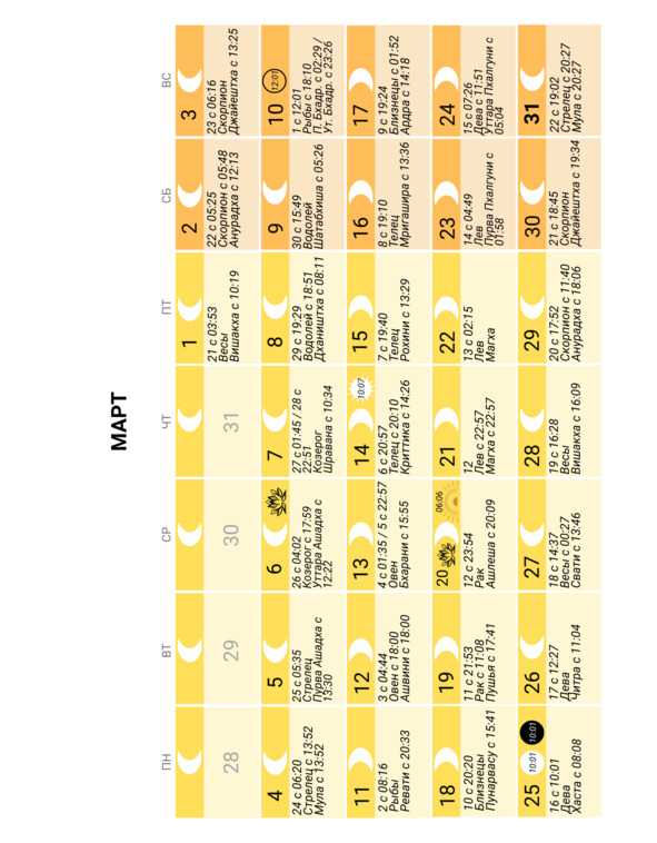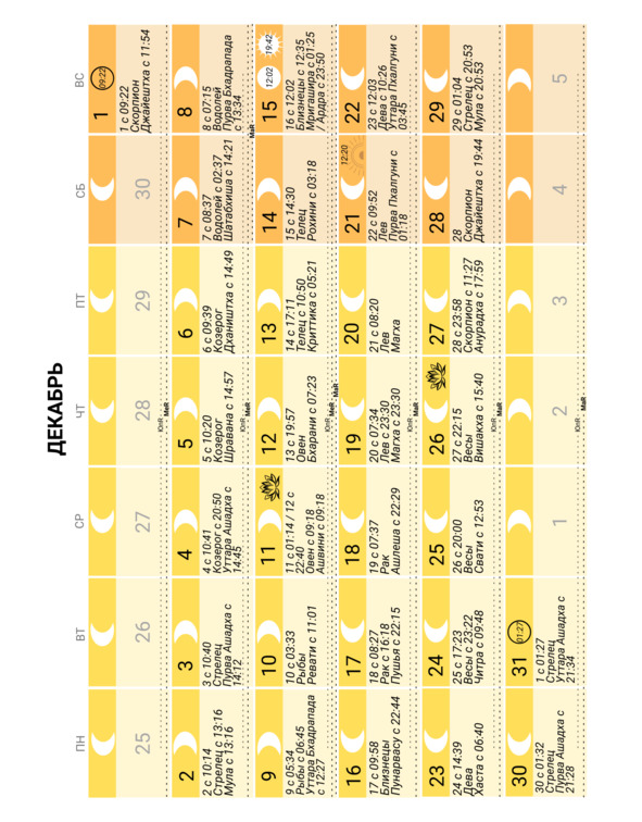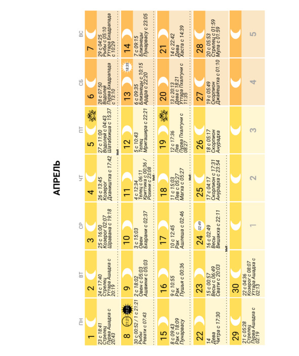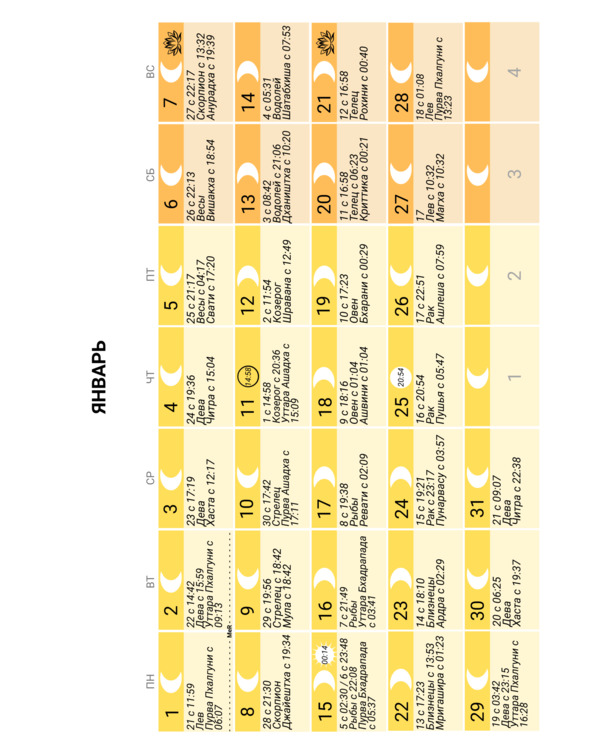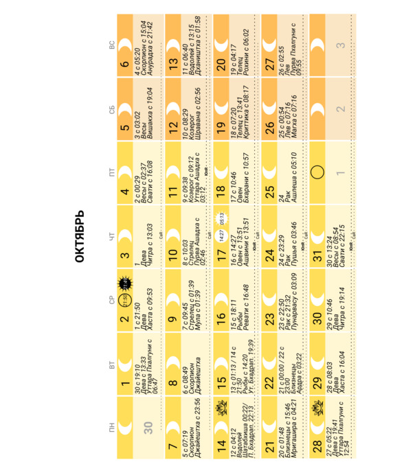 Благоприятность дня для разных действий определяется исходя из влияния знака Зодиака и накшатры, в которых находится Луна, а также характера титхи (лунных суток) и дня недели. Если учитывать эти основные факторы, можно выбрать наиболее подходящий день для любых повседневных или каких-то особенно важных действий.