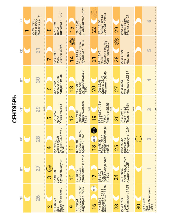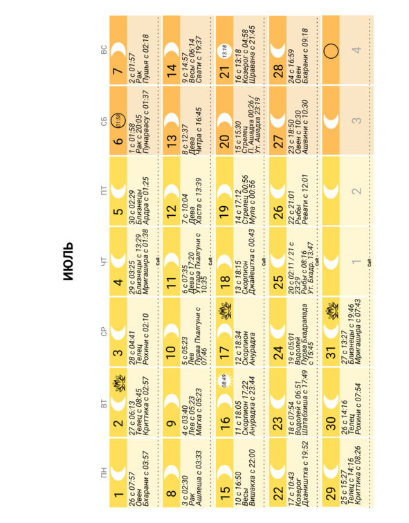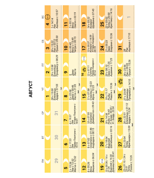 В конце каждой фазы особо выделяется один день. В периоде растущей Луны – это полнолуние (на санскр. пурнима), а на убывающей Луне – новолуние (амавасья). Вибрации новолуния более близки мужской энергии, а вибрации полнолуния – женской.
