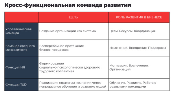 Организация – это система, поэтому ни одна функция (подразделение) в одиночку не сможет сформировать новую модель организационного поведения. Справиться с этой задачей способна только распределенная развивающая функция, другими словами, кросс-функциональная команда из специалистов HR, T&D, управленцев и среднего менеджмента.