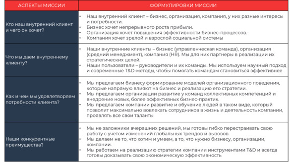 Миссия – это идеологический документ, который определяет поведение сотрудников «здесь и сейчас». Миссия (предназначение) самостоятельной развивающей функции T&D — реализация стратегии бизнеса средствами обучения и развития реальных команд в деятельности за счет сопровождения профессиональной деятельности сотрудников.