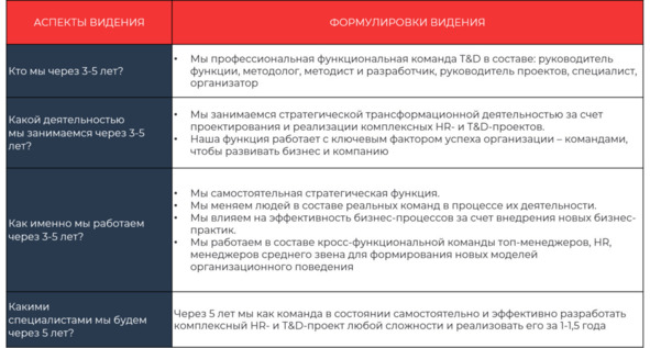 Видение необходимо для развития функции, потому что в нем содержатся буквальные подсказки для принятия уже сегодня решений: от кадровых до технологических. Видение самостоятельной стратегической функции T&D – это стратегический отдел современной организации, который постоянно работает с ключевым фактором успеха – людьми (командами в деятельности) для развития бизнеса, организации, компании.