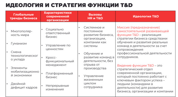 Все тексты, которые разместились на предыдущих страницах, мы свели в одну таблицу, чтобы можно было увидеть взаимосвязи в цепочке от глобальных трендов до идеологии функции T&D.