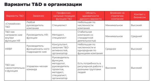 Сейчас функция T&D может воплощаться в организации в самых различных вариантах: «стихийное» T&D, T&D как направление внутри функции HR, HRBP, T&D как самостоятельная функция.