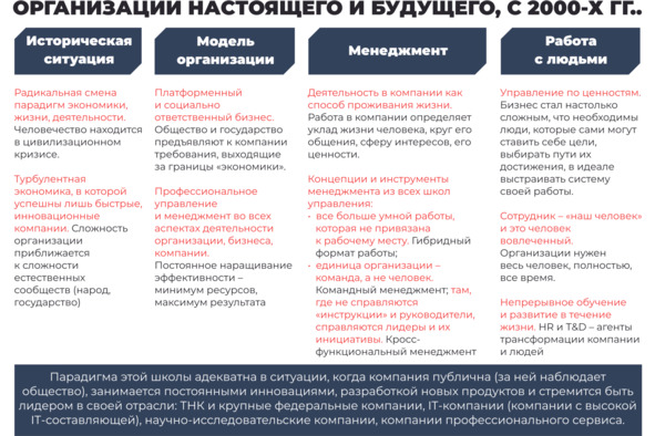 Представления о модели организации прошли эволюцию от индивидуального ручного труда до ТНК с бюджетами и возможностями государства. Ответ на вопрос «Что дальше?» зависит от пристрастий каждого конкретного человека. Мы, естественно, предлагаем свое видение. Это наш форсайт, какой должна быть современная организация, исходя из логики развития управления, рынка и общества.