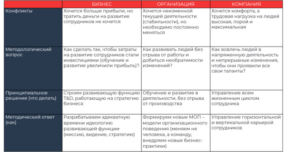 • Системный кризис на рынке и ценностный конфликт между бизнесом, организацией и компанией задают вызов функциям HR и T&D – непрерывное развитие. Вызовы также создают структурный конфликт между этими функциями.