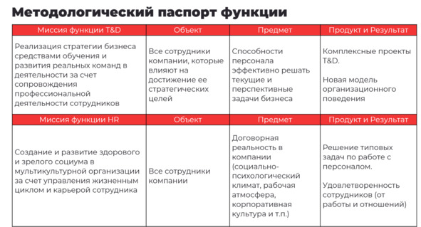 Чтобы «развести» функции HR и T&D, воспользуемся инструментом под названием методологический паспорт функции2.